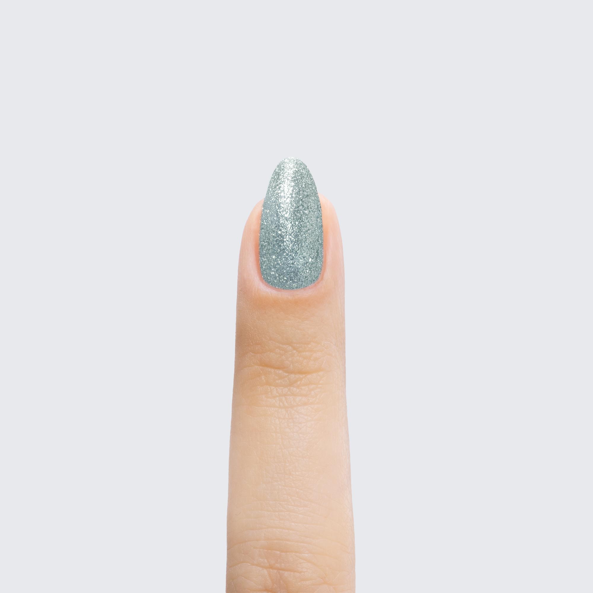 Silver with pale blue tint. Metallic foil sparkle. Opaque. Cool undertone.